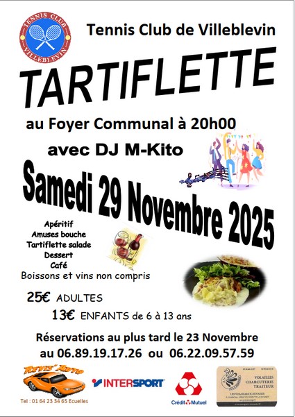 TARTIFLETTE du Tennis Club de Villeblevin, le 29 Novembre au Foyer Communal à 20h00 avec DJ M-Kito